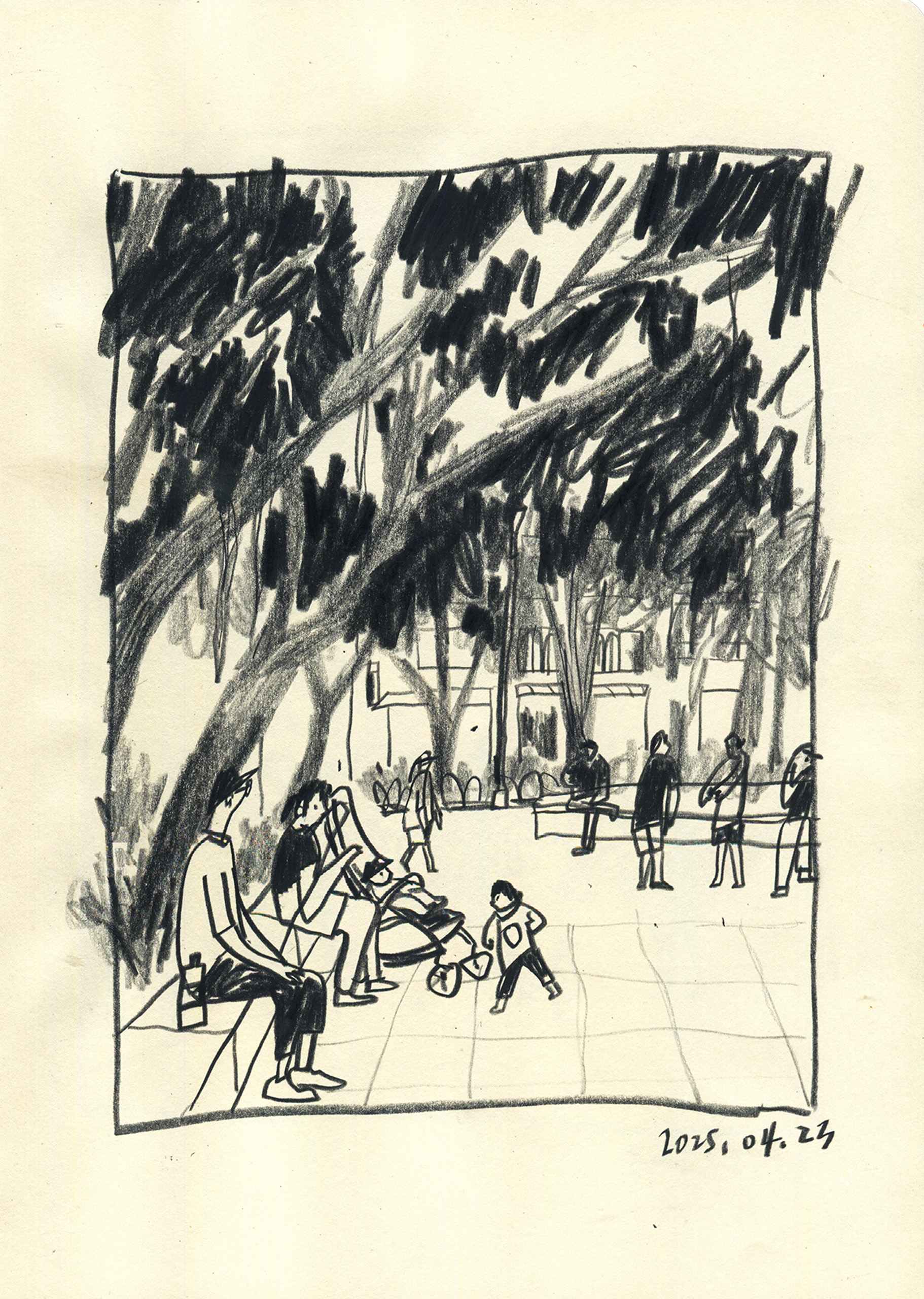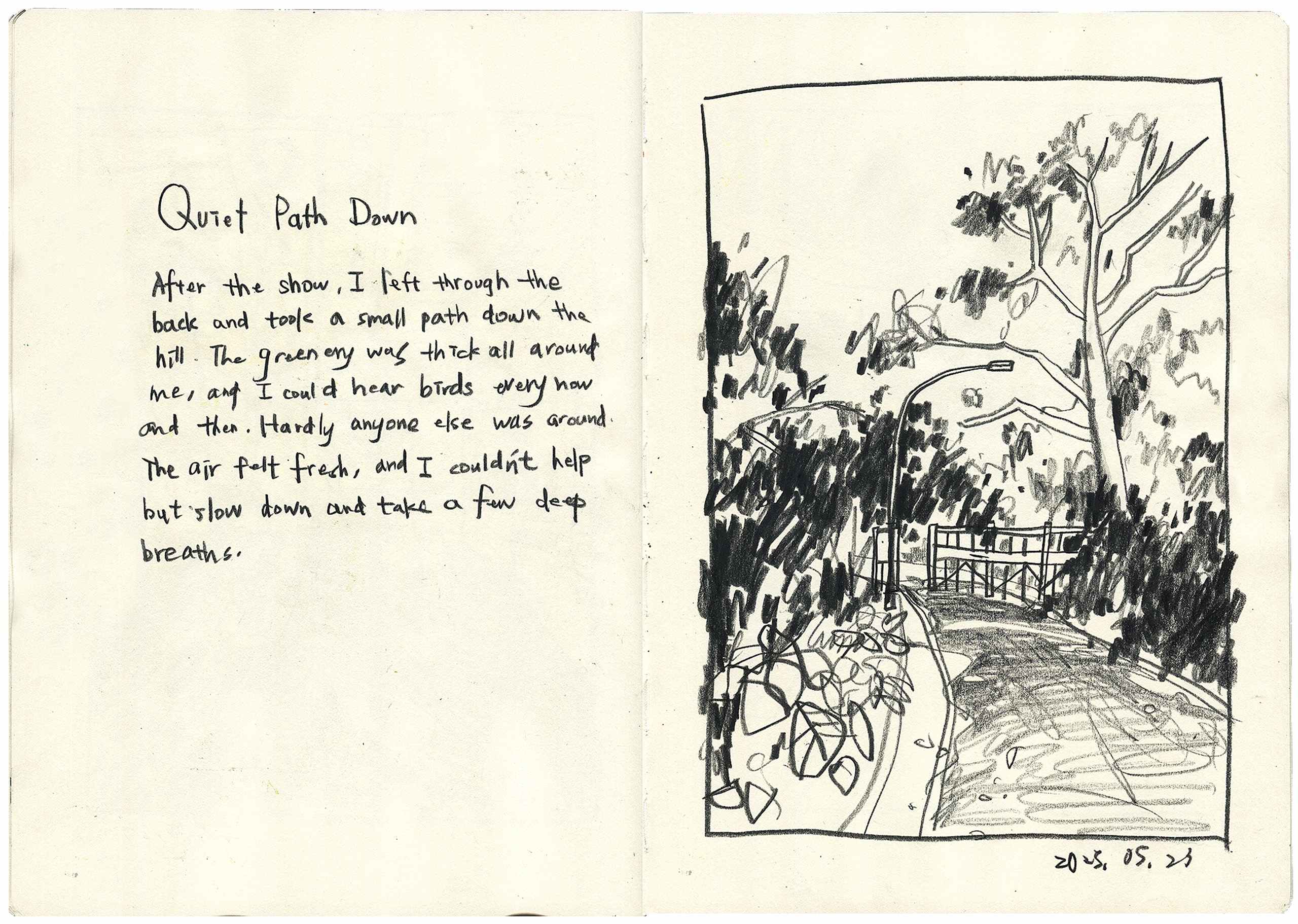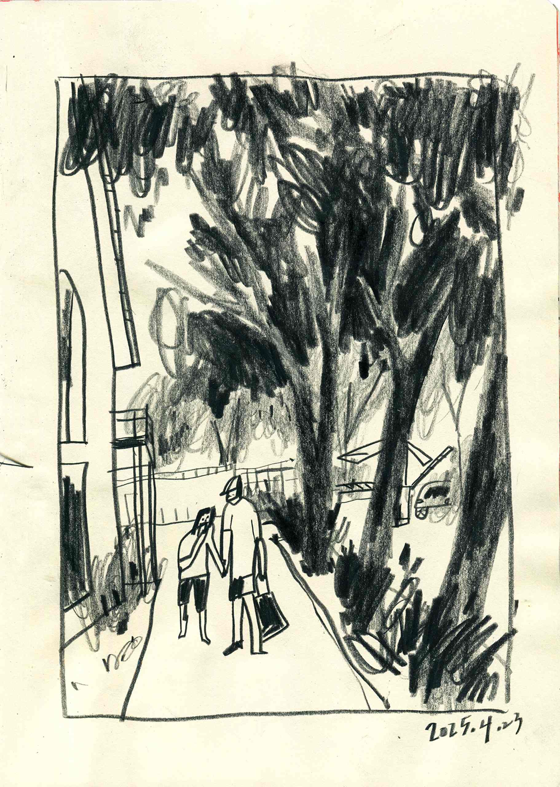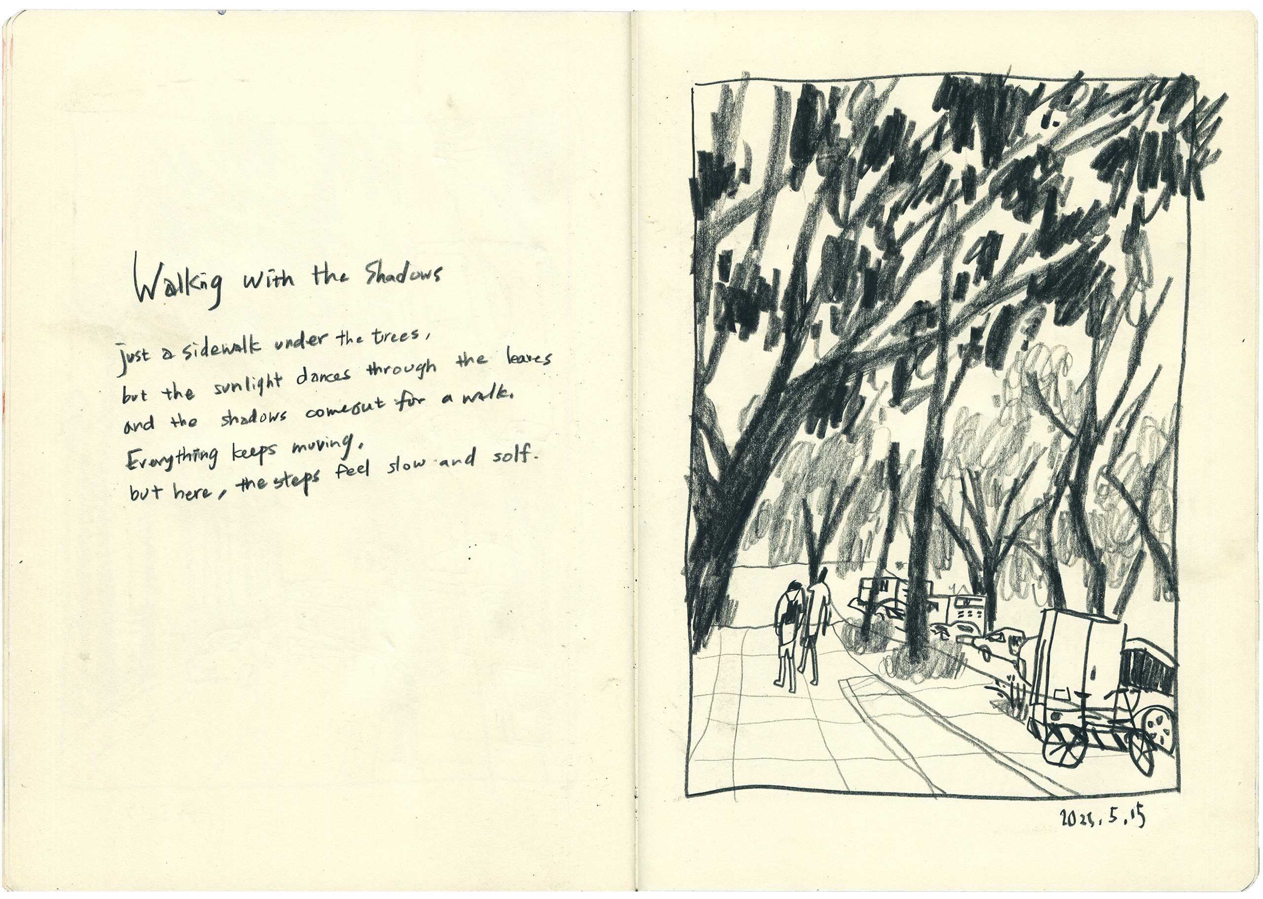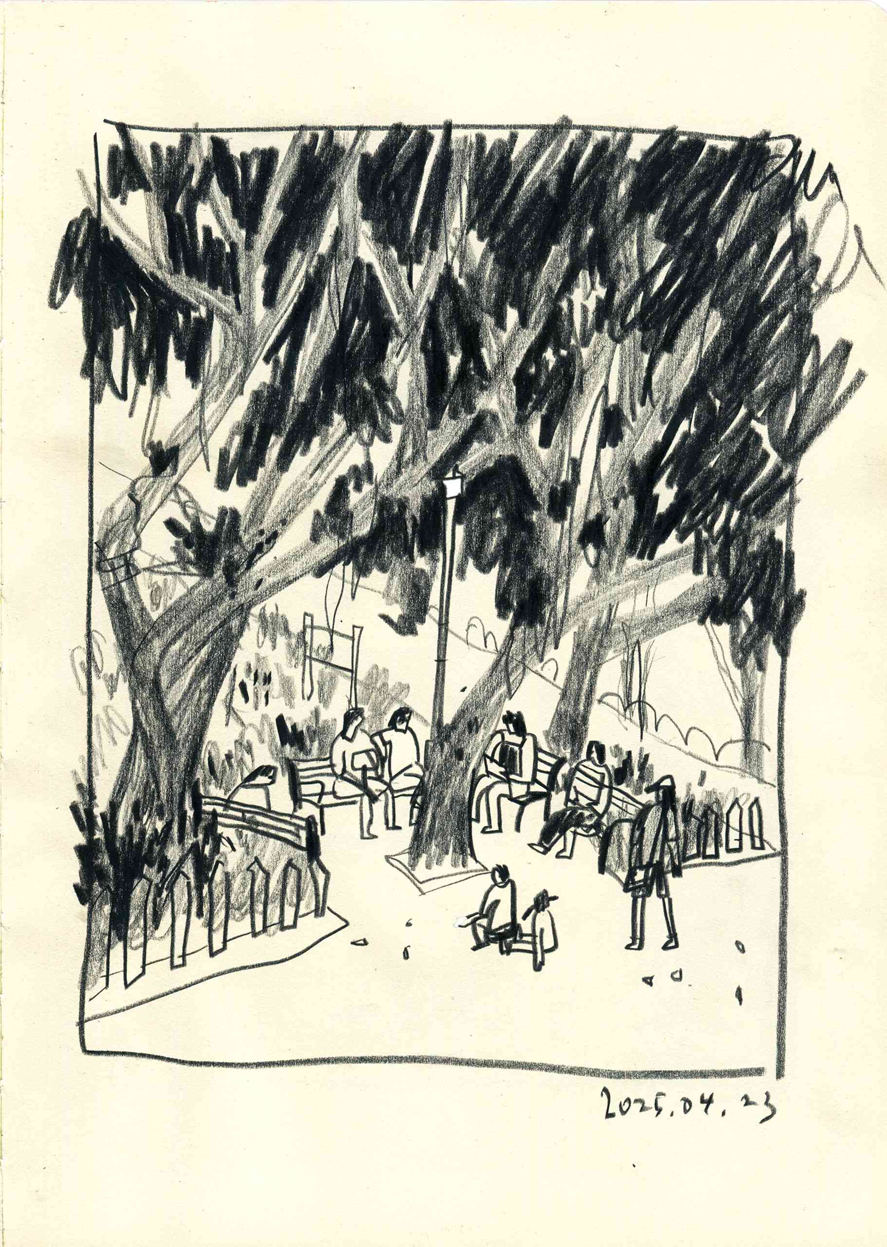 With my sketchbook in hand, I visit ordinary places—parks, street corners, quiet paths—and record what I see, feel, and think in that very moment. Each drawing is a way of slowing down, of paying close attention to scenes that are often overlooked.This series is not just about drawing what I see, but about writing with images—using composition to hold rhythm, using color to express feeling, and using observation to connect with the world around me.It might be just today. But if I remember it, maybe it becomes something more.