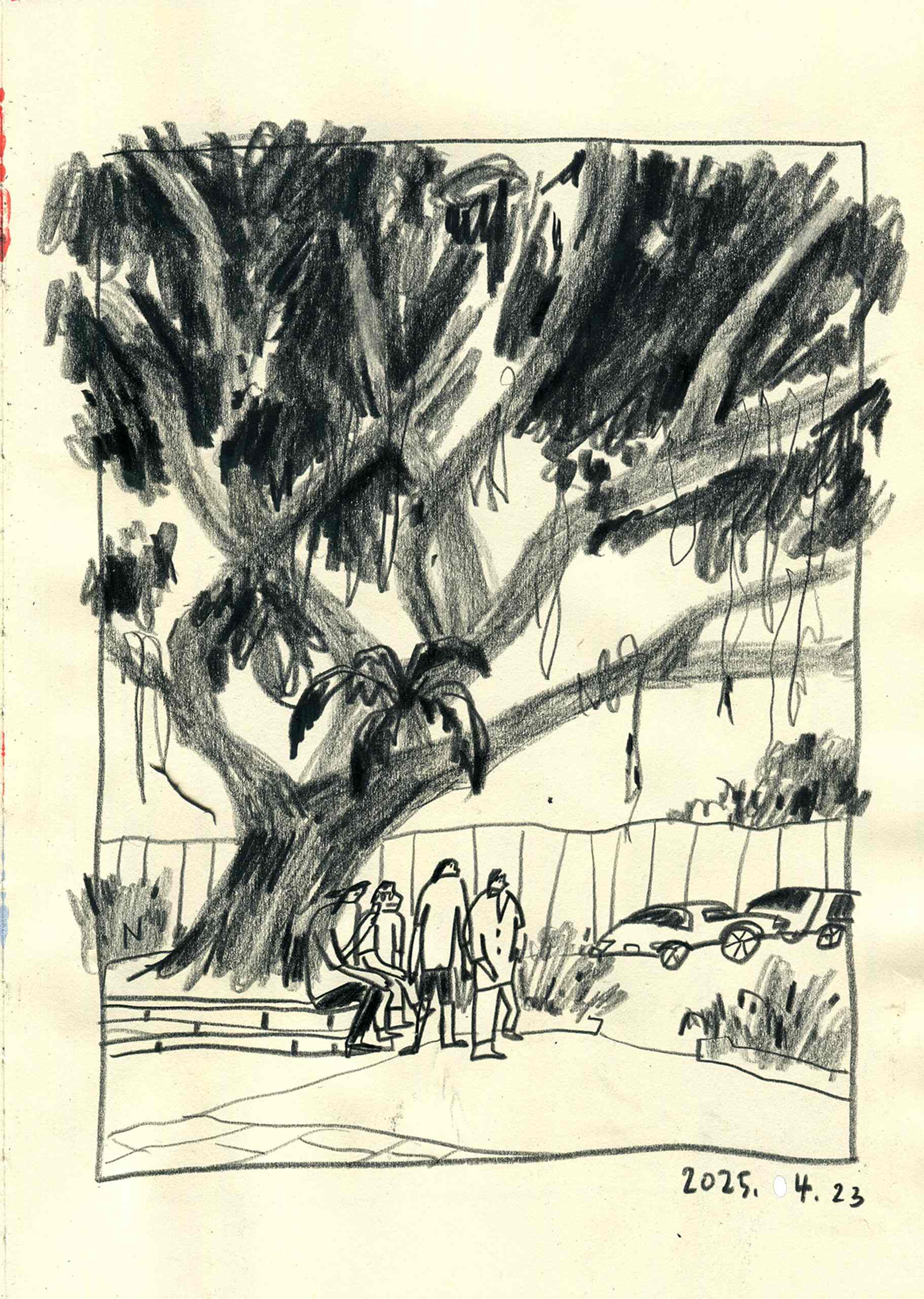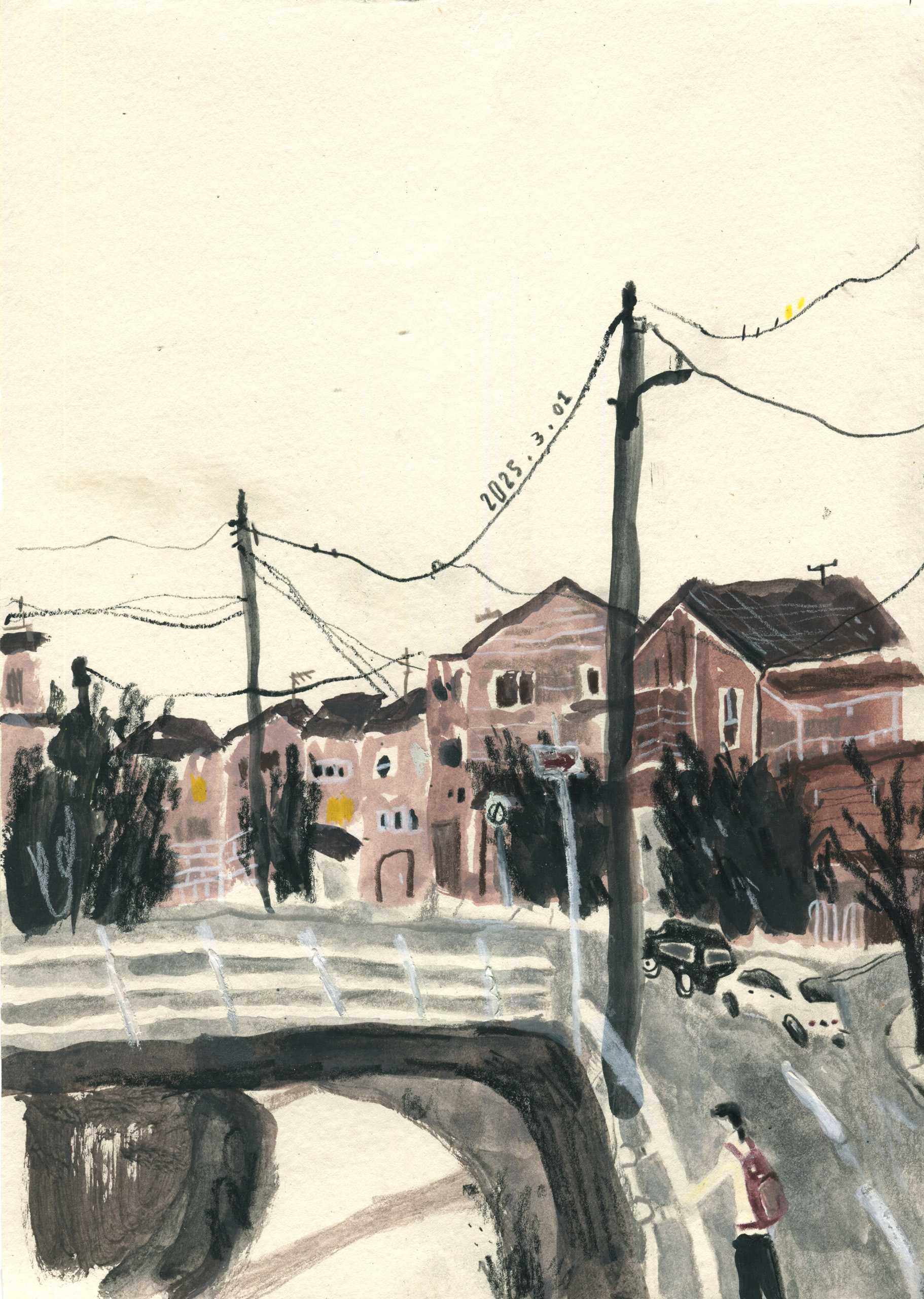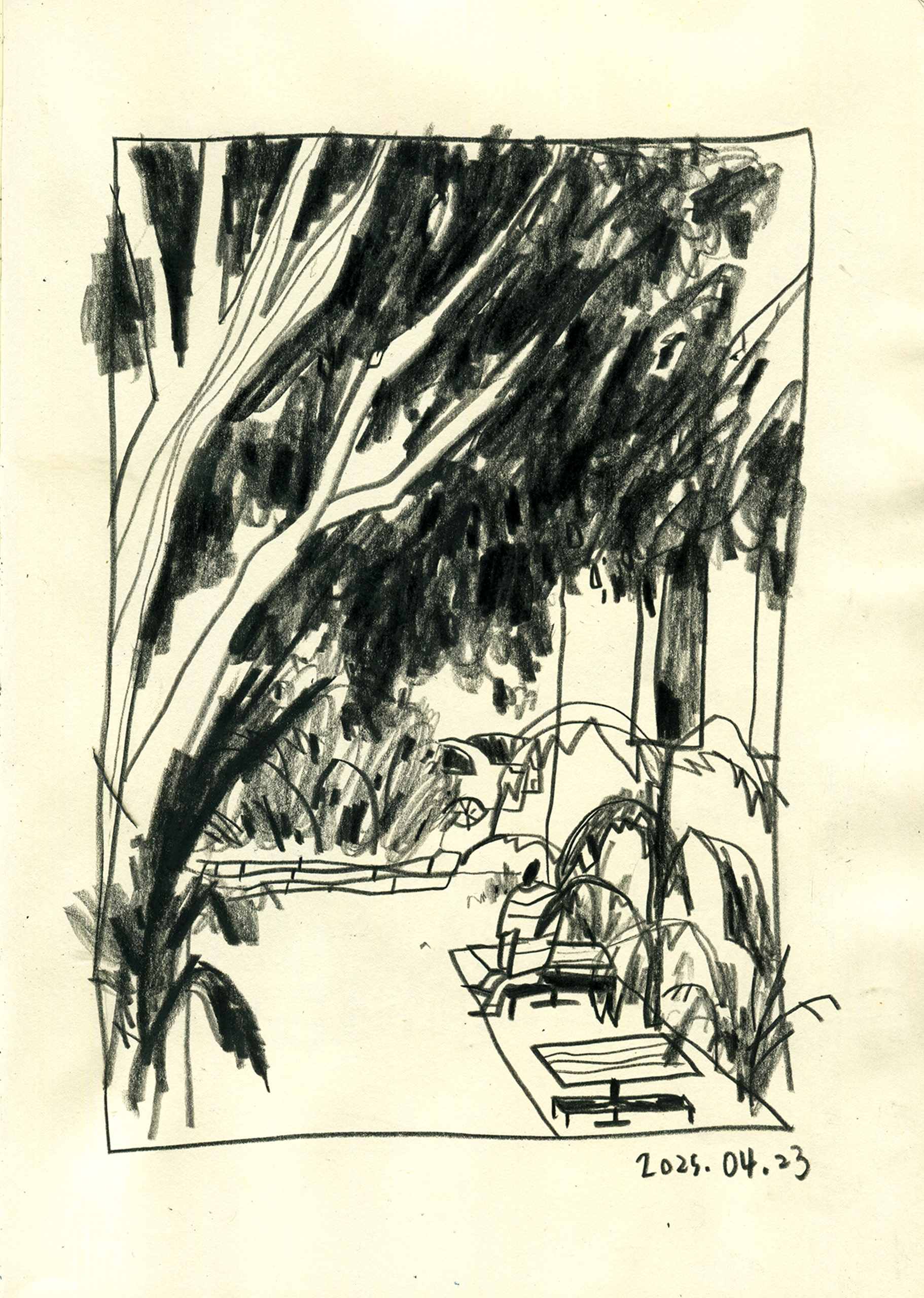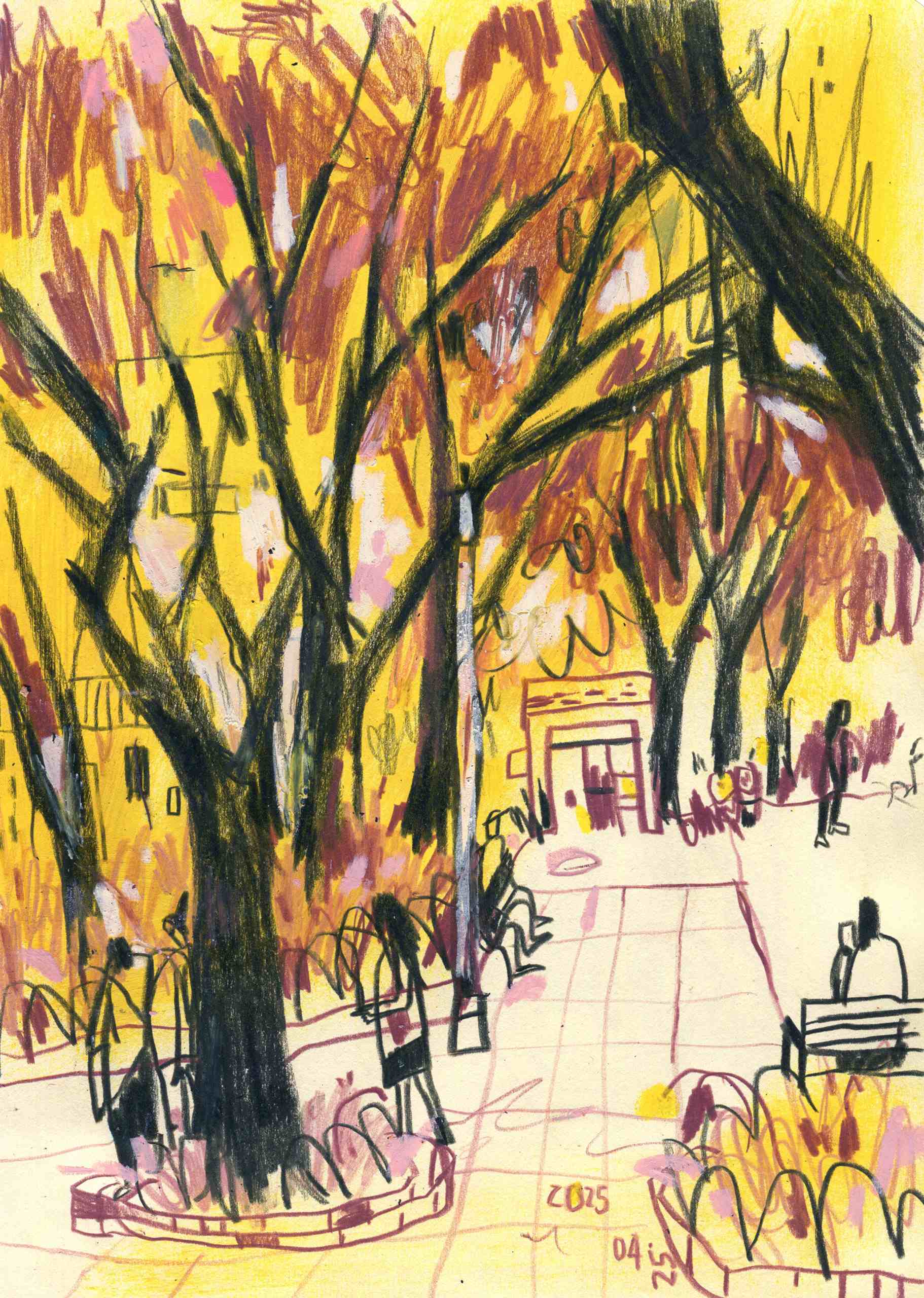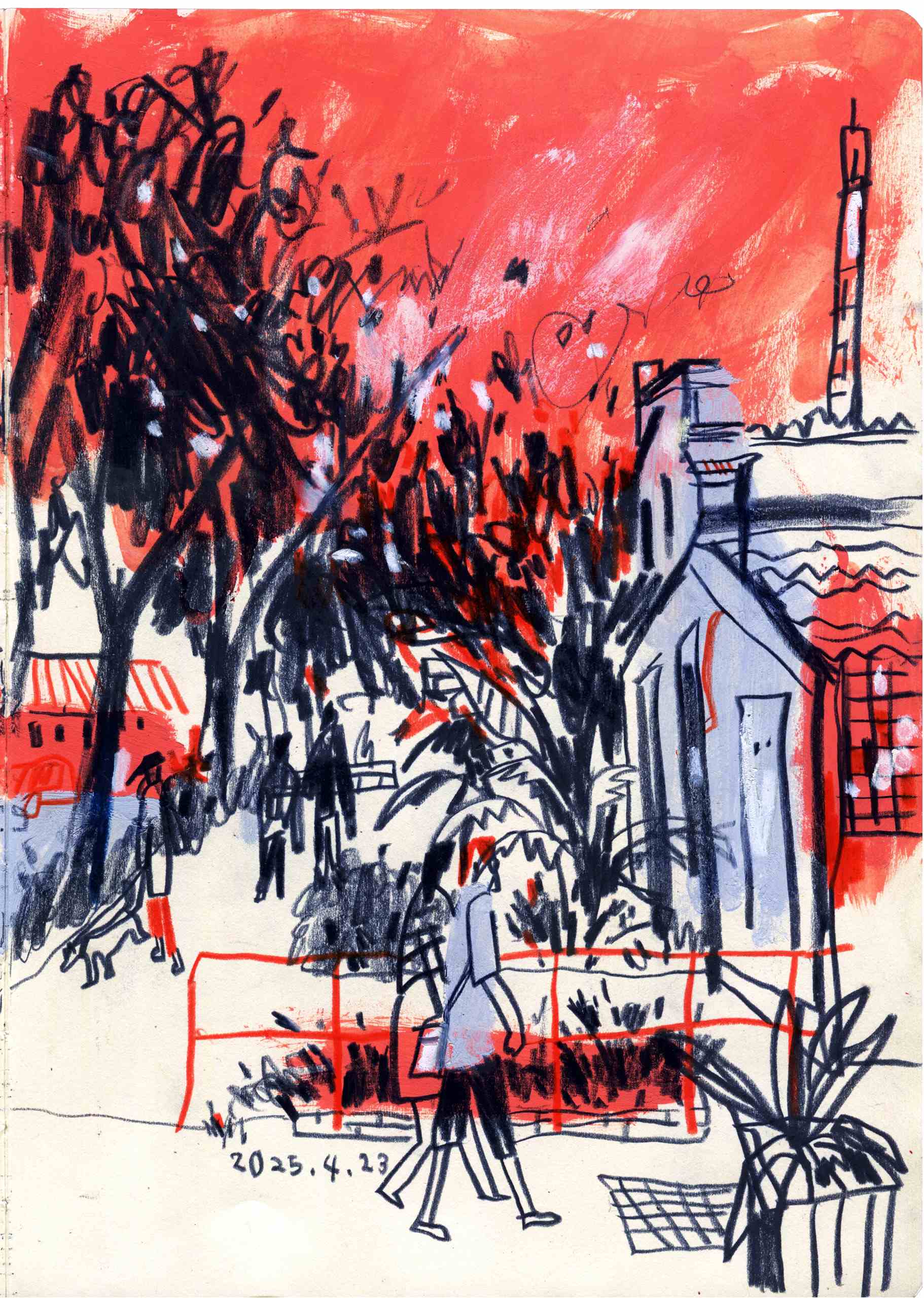 With my sketchbook in hand, I visit ordinary places—parks, street corners, quiet paths—and record what I see, feel, and think in that very moment. Each drawing is a way of slowing down, of paying close attention to scenes that are often overlooked.This series is not just about drawing what I see, but about writing with images—using composition to hold rhythm, using color to express feeling, and using observation to connect with the world around me.It might be just today. But if I remember it, maybe it becomes something more.