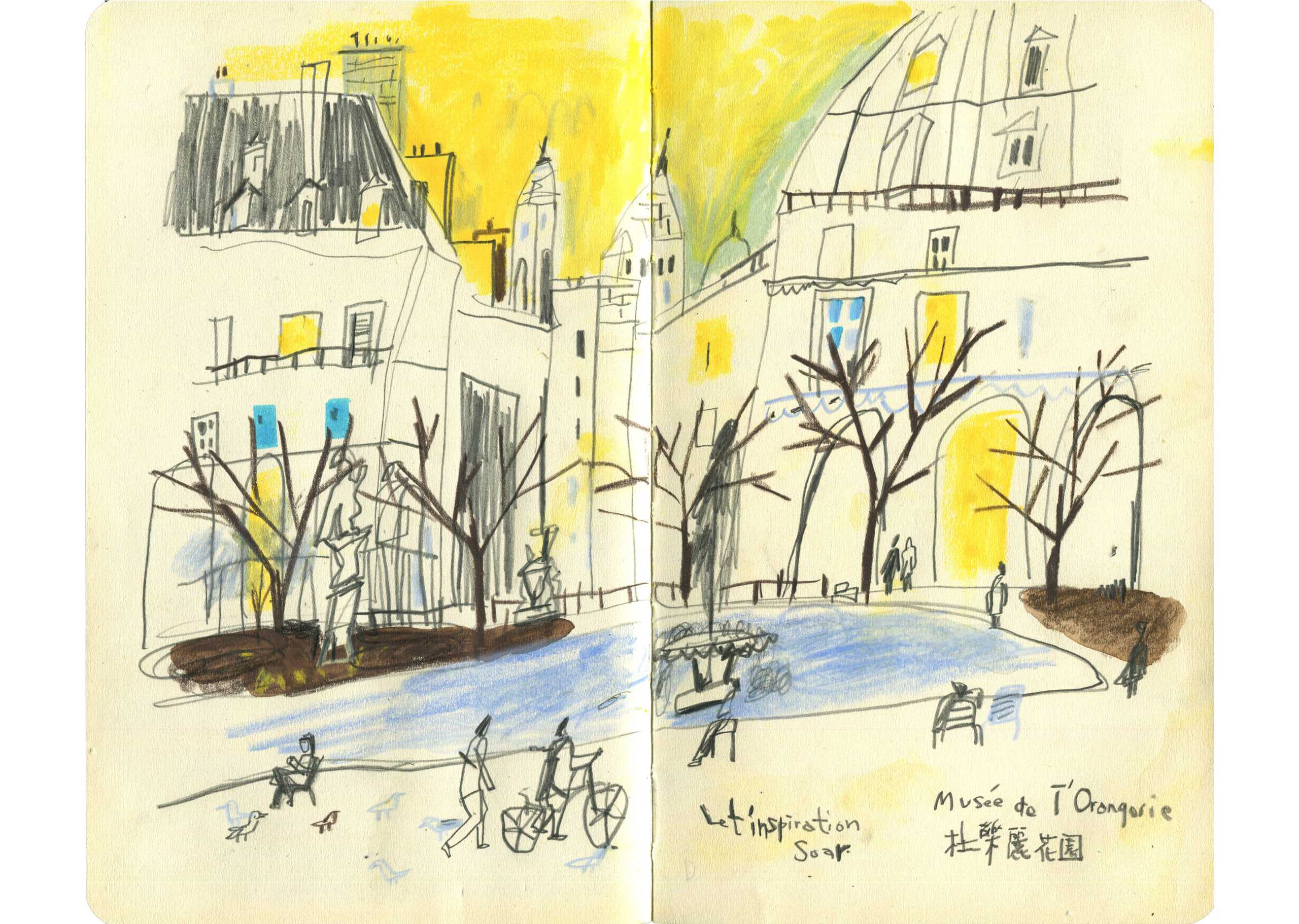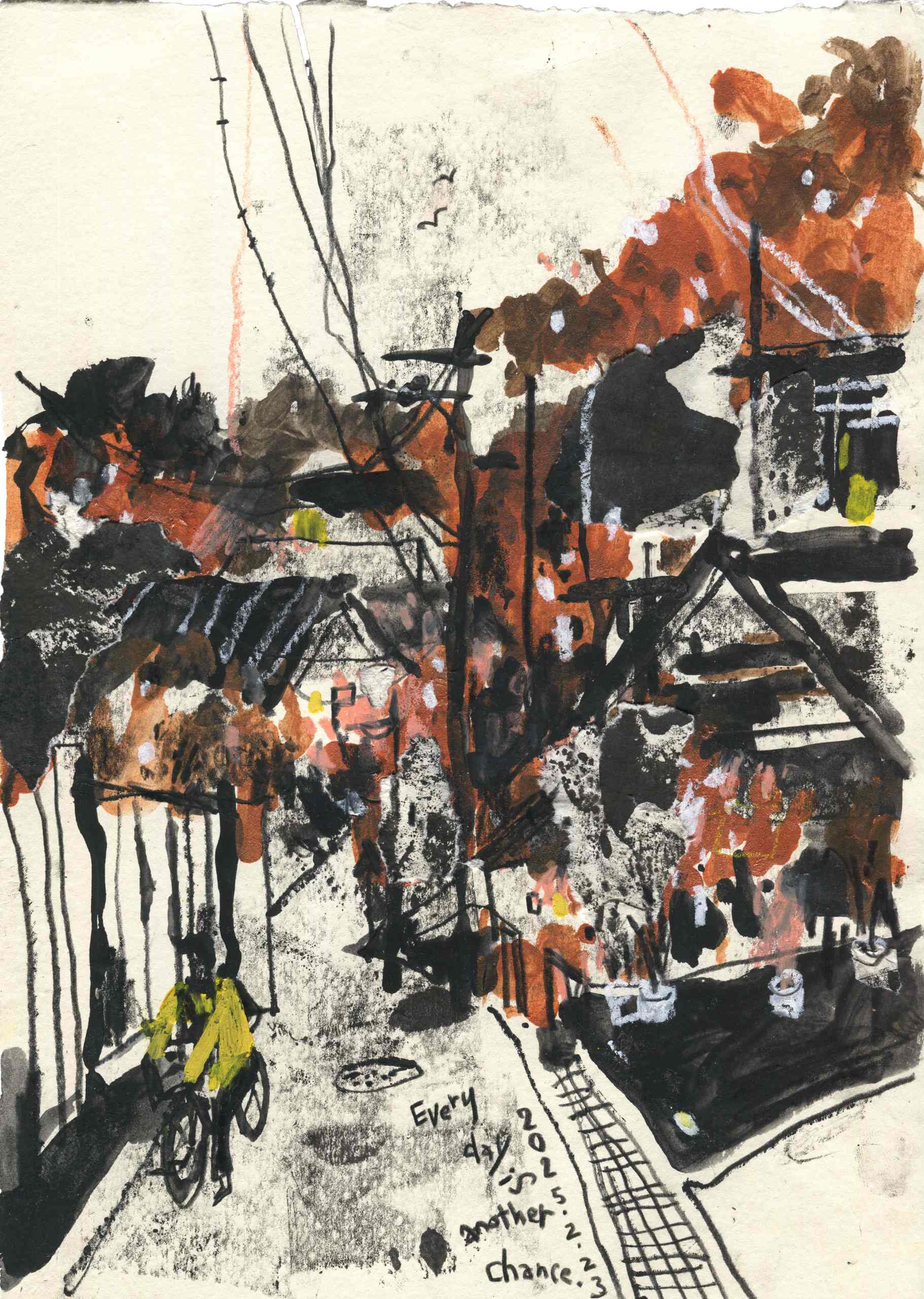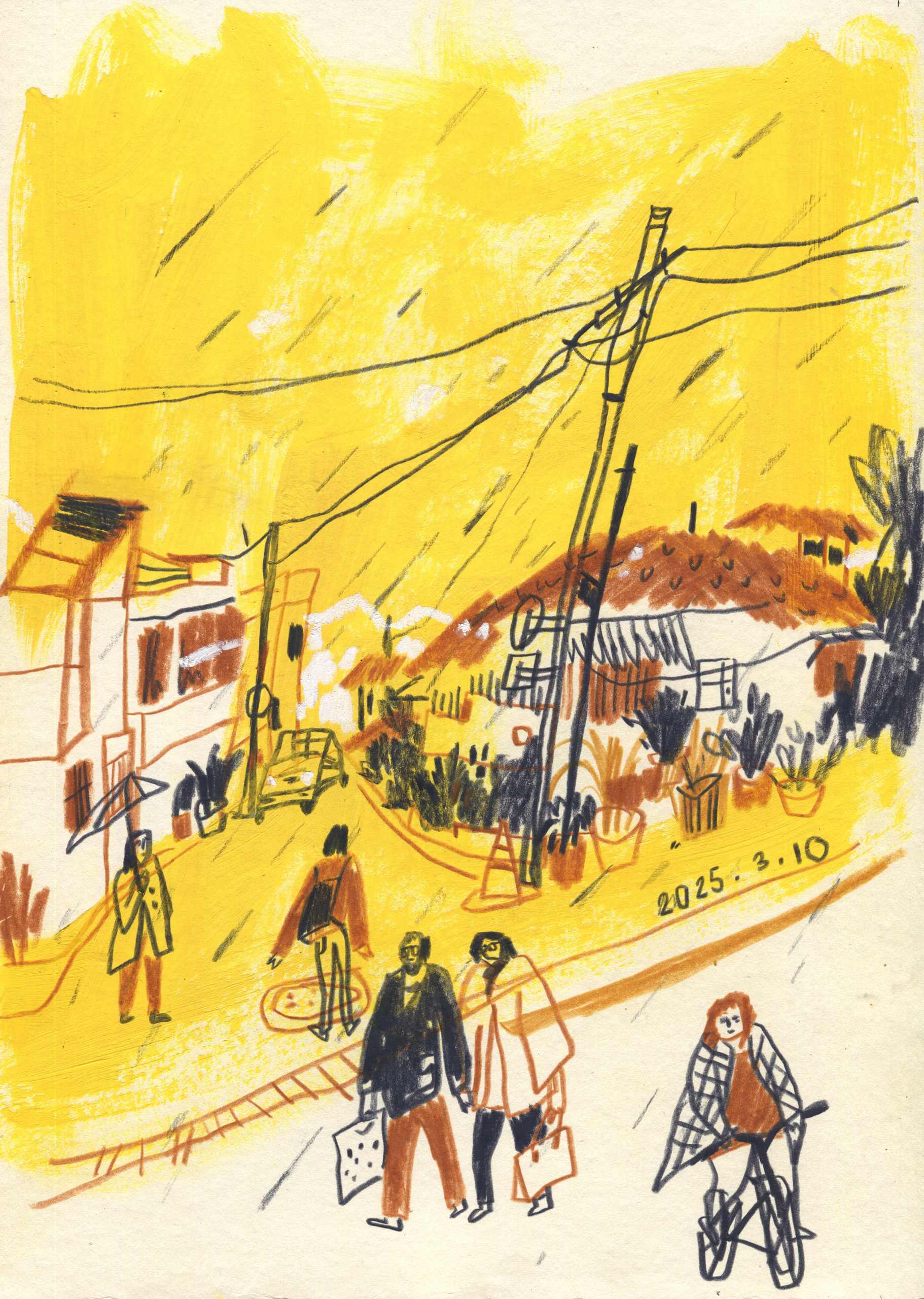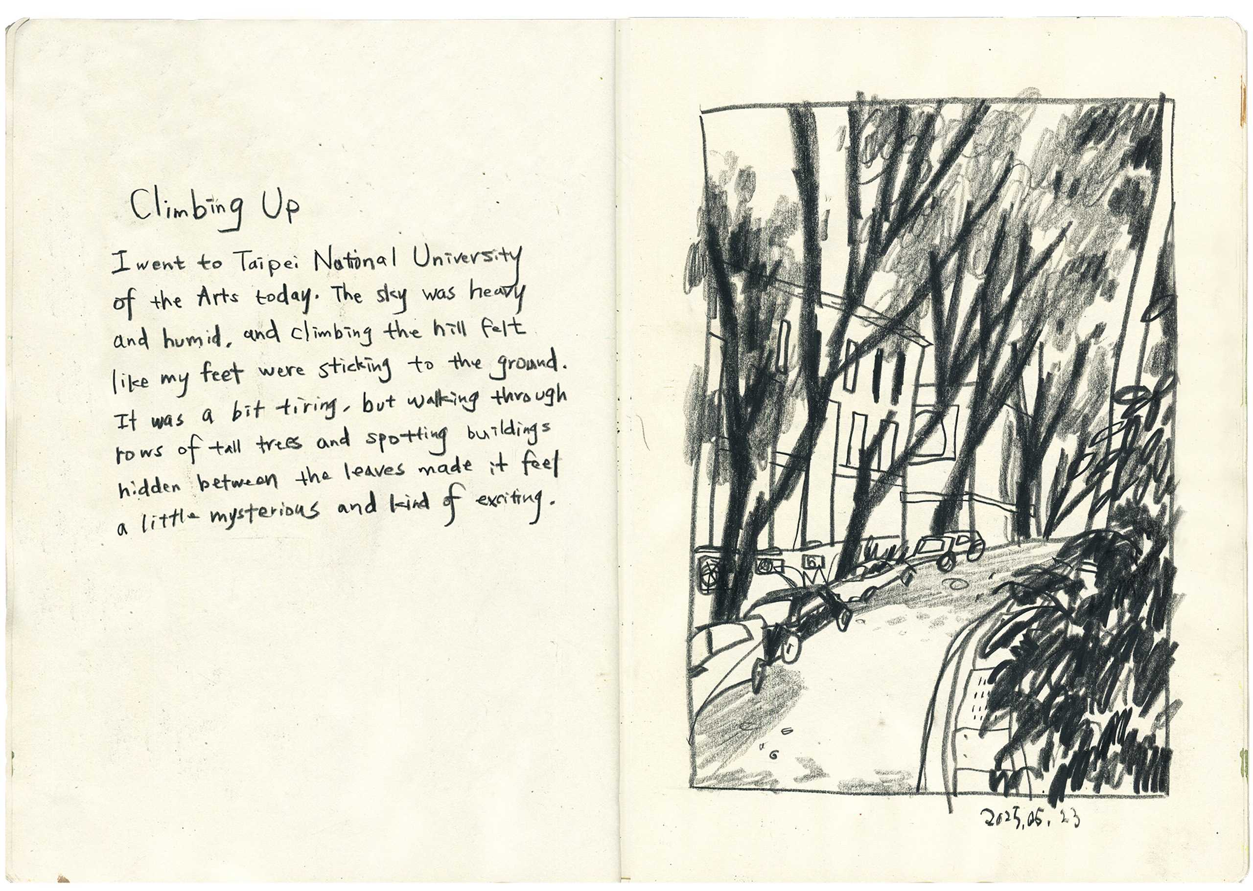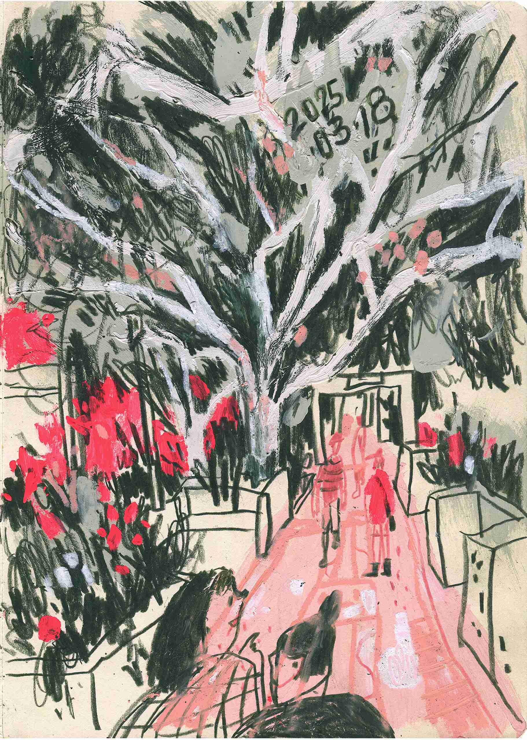 With my sketchbook in hand, I visit ordinary places—parks, street corners, quiet paths—and record what I see, feel, and think in that very moment. Each drawing is a way of slowing down, of paying close attention to scenes that are often overlooked.This series is not just about drawing what I see, but about writing with images—using composition to hold rhythm, using color to express feeling, and using observation to connect with the world around me.It might be just today. But if I remember it, maybe it becomes something more.